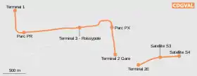 CDGVAL — безкоштовний автоматичний трансфер до аеропорту Париж-Шарль де Голль, що складається з двох ліній: першу лінію, відкрито 4 квітня 2007 року, другу — 27 червня 2007 року. Перша лінія має п'ять станцій та сполучає три термінали аеропорту, станції RER та TGV та віддалені автостоянки, час в дорозі — 8 хвилин.