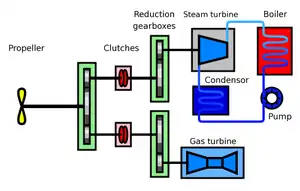 У цій системі коробка передач дозволяє як окрему роботу парової чи газової турбіни, так і їх одночасну роботу. Зазвичай для руху із крейсерською швидкістю використовується парова турбіна, а для прискорення та руху з максимальною швидкістю долучається газова турбіна.