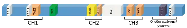 - Ще одна цистеїн/гістидин-збагачена ділянка (СН3), що містить цинковий палець TAZ2 і цинковий палець типу ZZ;