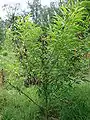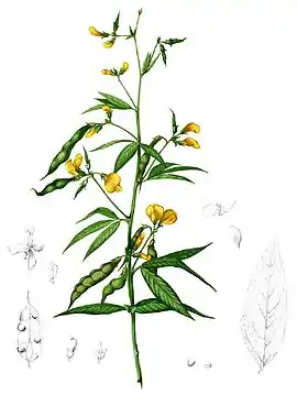Кущі висотою 1–4 метри з одеревесневаючими гілками. Листя чергове, складне, складаються з трьох шкірястих листочків, ланцетоподібних із загостреним кінцем. В основі кожного листочка знаходиться прилисток. Листові пластинки покриті жовтими крапкоподібними залозками, зверху вони мають оксамитовий наліт, знизу — густе шовковисте запушення. Мають невеликі яйцюватої форми прилистки. Квітки жовті, зібрані по 2–6 штук в китиці в пазухах листків.