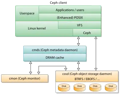- Пристрої зберігання об'єктів (ceph-osd) — дійсно зберігають вміст файлів. В ідеальному випадку, OSD зберігають свої дані в локальній файловій системі btrfs, щоб задіяти свою вбудовану copy-on-write властивість, хоча й інші локальні файлові системи можуть використовуватися теж.[7]
