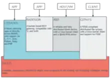 - Шлюзи передачі репрезентативного стану (RESTful) (ceph-rgw), які розкривають рівень зберігання об'єктів як інтерфейс, сумісний з Amazon S3 чи OpenStack Swift API