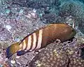 Риба до 55 см завдовжки. Темнокоричнева з синіми цятками. Інколи має до 6-ти темніших смуг на нижній частині тіла. Хвіст — круглий. Дорослі особи часто парами, чи невеликими групами. Харчується рибою.