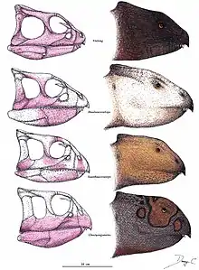 | Порівняння черепів відомих родів. Рожевим позначено відомі частини черепа. | |