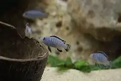 Статева зрілість настає з 9-12 місяців. Як і інші цихліди озера Малаві, під час нересту самки виношують ікру в роті. Під час нересту самки і самці починають здійснювати кругові інтенсивні рухи, які нагадують танок. Коли самки відкладають ікру, вони намагаються «підібрати ротом» імітацію ікри на анальному плавці самця, а самці в цей момент виділяють сперму, що потрапляє до роту самки і запліднює ікру. Самки можуть відкладати 25-90 ікринок. Інкубація у роті триває 17-22 діб. За необхідності можна здійснювати штучні інкубацію. Для мальків стартовим кормом є: наупліуси артемії, циклопи тощо.