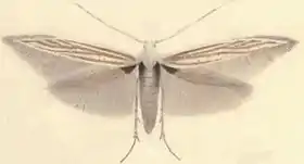 Розмах крил 9,5-13 мм[2]. Передні крила кремового забарвлення з білими поздовжніми смугами. Бахрома на крилах каштанового кольору.