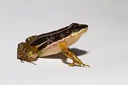 Дрібна жаба завдовжки до 24 мм. Тіло коричневого забарвлення з характерними темними парними дорсолатеральними смугами.[3]