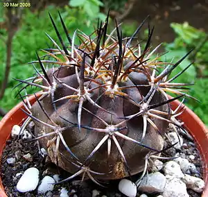 Радіальні колючки (6-10) прямі або трохи зігнуті, чорні. Центральні колючки чорні, прямі, кількістю 0-3, до 3 см завдовжки.