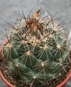 | Центральні колючки | 1, злегка зігнуті, трохи сильніші ніж радіальні, до 2 см завдовжки, чорні, основа світле. Буває 3-4, одна з яких домінує, а інші 2-3 часто спрямовані вгору і більш тонкі. |