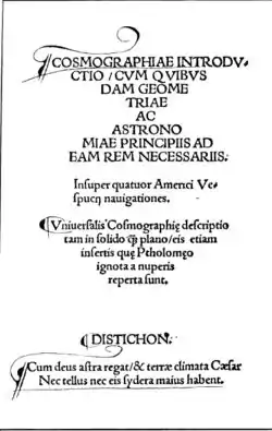 - Повна назва: лат. Cosmographiae introductio cum quibusdam geometriae ac astronomiae principiis ad eam rem necessariis. Insuper quatuor Americi Vespucii navigationes. Universalis Cosmographiae descriptio tam in solido quam plano, eis etiam insertis, quae Ptholomaeo ignota a nuperis reperta sunt.
