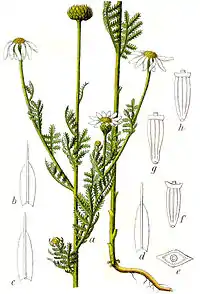 Однорічна рослина 20–60(70) см. Рослина густо-біло-повстяна. Листки гребінчато-перисторозсічені, їхні частки на краю зубчасті, на верхівці тупуваті. Кошик 2–2.5 см в діаметрі[2].