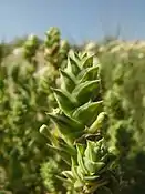 Стебла до 50 см, голі й білуваті, деревні біля основи. Листя 1–13 × 1–9 мм, яйцеподібні або яйцеподібно-ланцетні, шкірясті, голі, з білими жорсткими краями. Колосся 20–60 мм. Квітки жовті. Коли в цвіту, виділяє характерний запах. 2n = 22.