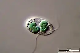 ![]() C. paradoxa. Видно ціанели в стані поділу, ядро та джгутики. Масштабна лінійка: 10 мкм | ||||||||||||||||||