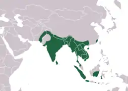 Країни поширення: Бангладеш, Бутан, Камбоджа, Китай, Гонконг, Індія, Індонезія, Лаос, Малайзія, М'янма, Непал, Пакистан, Шрі-Ланка, Таїланд, В'єтнам. Вид був записаний від рівня моря до висоти 400 м над рівнем моря. Цей вид зустрічається в найрізноманітніших місцях проживання у сільській місцевості, первинних і вторинних лісових і в міських місцях проживання.