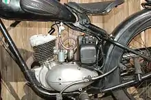 Картер двигуна і головка циліндра відливалися з алюмінієвого сплаву, циліндр з чавуну. Мотор мав генератор постійного струму (6 Вольт), карбюратор з поплавком і голчастим клапаном. У середині картера крутний момент від колінвалу на трансмісію передавався роликовим ланцюгом, багатодискове зчеплення і коробка передач працювали в масляній ванні.