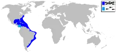 Поширена у західній Атлантиці вздовж берегів Флориди, у Карибському басейні, на південь до Аргентини.