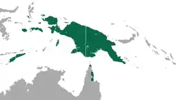 Країни поширення: Австралія, Індонезія, Папуа Нова Гвінея, Тимор-Лешті. Мешкає від рівня моря до 2700 м над рівнем моря. Цей вид мешкає в тропічних вологих лісах, мокрих відкритих лісах, сільських садах, фруктових і кокосових плантаціях.