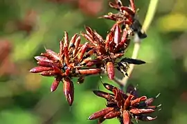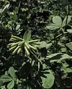 Багаторічна трав'яниста рослина, 30-200 см, іноді деревна біля основи. Має порожнисті стебла. Листя непарноперисті з 5 листочками. Листові фрагменти 20-40 х 12-20 мм, оберненояйцевидні. Суцвіття з (15)18—35 рожево-білими квітками. Плоди 8-10 х 1-2,5 мм, циліндричні, гладкі, червонувато-фіолетові або пурпурові колір, з 7-9 насінням. Насіння 1-1.3 (1.5) х 0,7-1,2 мм, яйцеподібне або кулясте, світло-коричневе або темно-коричневе, з темними плямами.
