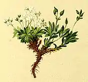 Це багаторічні поодинокі трав'янисті рослини. Базальний каудекс слабо розгалужений, іноді вкритий залишками листя й утворює невеликі розетки, формуючи невеликі купини. Кожна розетка потенційно з одним квітковим стеблом (до 10 штук в купині), часто з одним листком. Квіткові стебла висхідні, іноді короткі на початку цвітіння, 1–2 см, але подовжуються під час і після цвітіння до 5–15 см, голі, часто з червоним відтінком. Листові розетки в основному 2–3 см, а іноді до 10 см шириною. Листки чергові, блідо-зелені, до 14 × 2 мм, цілісні, від вузько оберненоланцетних до майже лінійних, серединні жилки дуже помітні. Обидві поверхні листя голі або рідко з рідкісними довгими волосками; краї листків з довгими, міцними, простими й іноді роздвоєними волосками, рідше голі.