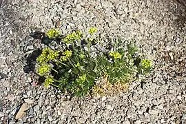 Суцвіття — китиці з 2–6 квітами, короткі спочатку й сильно подовжуються в плодовій стадії. Квітконіжки 1.5–4 мм, з волосками. Квіти радіально симетричні з 4 вільними чашолистками і пелюстками. Чашолистки до 2.3 × 1.5 мм, яйцеподібні, сірувато-зелені, часто з відтінком червоного або фіолетового кольору і з дуже чіткими білими краями. Пелюстки дуже маленькі й вузькі, блідо-жовті, 2–3 × 0.6–1.3 мм. Плоди — стручки до 10 × 5 мм, оберненояйцеподібні, оливково-зелені, голі або з рідкісними волосками. Насіння 6–9 в кожній комірці, до 1.5 × 1 мм, середнього коричневого забарвлення. 2n = 32 (4x).