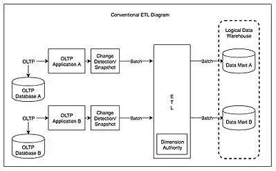 Зазвичай ETL системи об'єднують дані з численних застосунків (систем), які створені та підтримуються різними вендорами та розміщені на різному апаратному забезпеченні. Розрізнені системи, які містять первісні дані, нерідко підтримуються та використовуються різними співробітниками. Для прикладу, система обліку витрат може об'єднувати дані по фонду заробітної платні, продажам та придбанням.