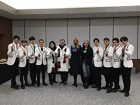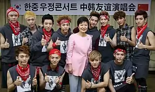 ![]() EXO у липні 2016 року Зверху, зліва на право: Бекхьон, Чен, Лей, Сехун, Чаньоль, ДіО, Кай Внизу, зліва на право: Сухо, Сюмін | |