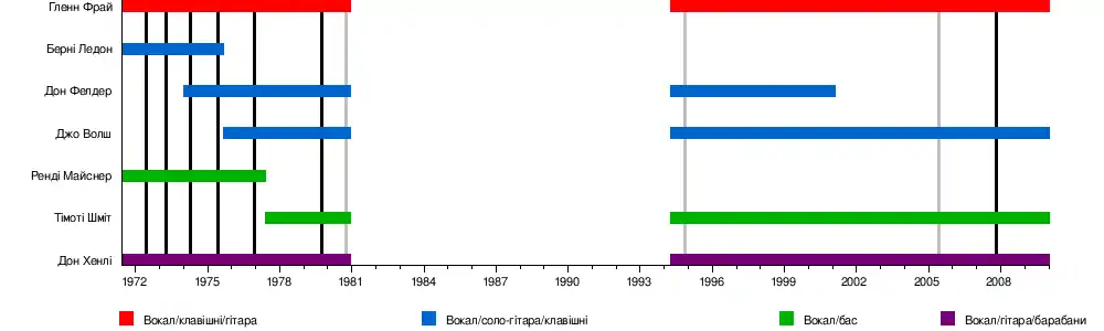 - Гленн Фрай — вокал, гітара, клавішні, губна гармоніка (1971–80, 1994–2016) 18 січня 2016 року, член і засновник групи Гленн Фрай помер в Медичному Центрі Колумбійського університету в Нью Йорку, у віці 67 років.