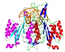 Ензим утворює гомодимер з двох 31-кДа одиниць, кожна з яких є одним поліпептидним ланцюгом та існує у вигляді глобули з α/β архітектурою. Кожна одиниця в димері містить мотив-«петлю», яка виступає з глобули та зв'язується з ДНК-мішенню при розпізнаванні.[1][2]