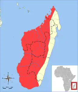 Ендемік Мадагаскару. Виявляється як на узбережжі, так і на високих плато центральних областей.