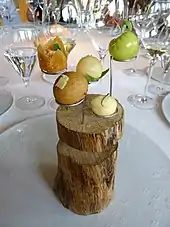 Як правило, пропонується набір з п'яти закусок, що демонструють смаки з різних куточків світу, щоб ознайомити гостя з оригінальними методами приготування їжі і її презентаціями. Наприклад, маленька кулька замороженої рибної маси, приправлена спеціями і змочена в маслі какао, представляє тайську кухню.