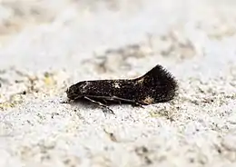 Розмах крил становить близько 12 мм. Голова чорнуватого кольору, з білуватим напиленням, лицьова частина у самиць білувата. Передні крила чорнуваті з білим напиленням і білою плямою в передній частині. Задні крила темно-сірі. Личинка блідо-жовтувата з блідо-коричневою головою з двома жовто-коричневими позначками.[1]