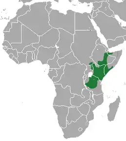 Вид поширений у Східній Африці (Ефіопія, Кенія, Сомалі, Південний Судан, Танзанія та Уганда). Трапляється у вологих саванах.