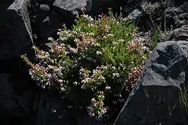 Цей вид є невеликим вічнозеленим дуже гіллястим чагарником заввишки 50–80(100) см[2]. Листки лінійні, довжиною 5–9 мм. Квітки з подовженими і дзвоноподібними вінчиками, утворюючи бічні або кінцеві китиці; квіти жовтаво-рожеві. Плоди — коробочки. Квітує у червні–серпні[3].