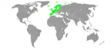 Північна й західна Європа (Бельгія, Люксембург, Естонія, Латвія, Литва, Бельгія, Німеччина, Нідерланди, Польща, Данія, Фінляндія, Ірландія, Ісландія, Норвегія, Швеція, Сполучене Королівство, Франція, Португалія, Іспанія). Вид натуралізований на східному узбережжі Канади й США, а також у Швейцарії. Вид культивується.