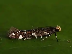 Тіло та кінцівки темнокоричневі, голова жовтувато-біла, по боках вохриста. Вусики темно-коричневі і мають п'ять білих кілець на кінчиках. Розмах крил 9-13 мм. Передні крила темно-коричневі з трьома велики білими плямами. В основі крил є також золотиста пляма. Задні крила світло-сірі.