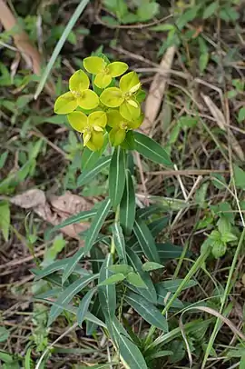 Це трава 15–25(100) см заввишки. Стебла поодинокі або численні, що виходять безпосередньо з міцного дерев'янистого стоібура, ≈ 1.2 см, верхні частини багато розгалужені, помірно запушені або гладкі та голі. Стеблові листки чергові, більші до верхівки; прилистки відсутні; ніжки листка відсутні або майже так; пластинки еліптичні, довго-еліптичні або яйцювато-ланцетні, 4–11 × 1–3 см, основа послаблена, округла або підрізана, край цілий, вершина від загостреної до майже гострої; листки поступово переходять у лускоподібні листки до основи стебла. Суцвіття — компактний кінцевий псевдозонтик, 5-6(7)-променевий. Ціатії сидячі або на коротких ніжках. Квітки жовті. Період цвітіння: травень — серпень; період плодоношення: липень — вересень. Коробочка 3-лопатева, 5–11 × 7–11 мм, гладка, гола, світло-зелена. Насіння кутасто-яйцеподібне, 5–6 × 4–5 мм, від світло-коричневого до сіро-коричневого, адаксіально смугасте, гладке, ± блискуче[1][2][3].