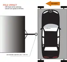 - Удар об стовп. Виконується на швидкості 29 км/год. Автомобіль ставлять на візок та вдаряють по стовпу, при цьому імітується ситуація втрати керування на слизькій дорозі.
