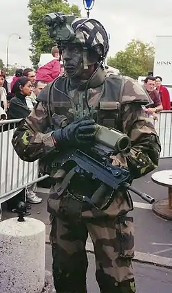 - Особиста зброя представлена у трьох варіантах — автомат FAMAS F1, легкий кулемет FN Minimi і снайперська рушниця FR-F2. Уся зброя оснащена новими прицілами денного і нічного бачення, з удосконаленими засобами цілевказівки, а також малогабаритною відеокамерою. Рядові піхотинці використовують приціли з електрооптичними підсилювачами яскравості зображення «Clara», а командири підрозділів — інфрачервоні приціли. При цьому усі бійці можуть передавати відеозображення в режимі реального часу усередині мереж FELIN;