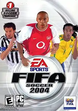 ![]() FIFA Football 2004 обкладинка версії для N-Gage. На обкладинці зображені Алессандро Дель П'єро з «Ювентуса», Тьєррі Анрі з «Арсеналу», і Роналдінью одягнений в форму збірної Бразилії. | |