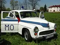 Варшава також була створена у версії, призначеній для Громадянської міліції та Добровольчого резерву Громадянської міліції. Поліцейська машина базувалася на цивільній версії. Однак він відрізнявся фарбуванням (білий або кремовий корпус із синьою смугою та маркуванням),світловим сигналом, встановленим на даху, та сиреною. Додатково були встановлені матові задні та бічні вікна. Остання партія поліцейських автомобілів надійшла від FSO до Громадської міліції наприкінці 1972 року.[22]