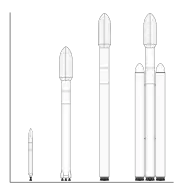 Зліва направо, Falcon 1, Falcon 9 v1.0, Falcon 9 v1.1 та Falcon Heavy