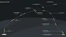 Знизившись до висоти у 58 км (6 хв. 28 с польоту), 1-ий ст. вмикає три двигуни на 22 с, зменшивши свою швидкість із 1450 м/с до 857 м/с.