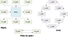 - Комутована зв'язна архітектура (switched fabric) Заснована на застосуванні комутаторів. Дозволяє підключати більшу кількість пристроїв, ніж в керованій петлі, при цьому додавання нових пристроїв не впливає на передачу даних між вже підключеними пристроями. Оскільки на основі комутаторів можна будувати складні мережі, на комутаторах підтримуються розподілені служби управління мережею (fabric services), передачі даних, що відповідають за маршрути, реєстрацію в мережі і привласнення мережевих адрес і інші.
