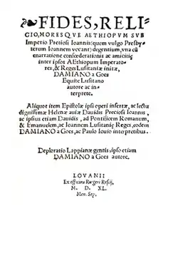 - Повна назва: Fides, religio, moresque Aethiopum sub imperio Pretiosi Ioannis (quem vulgo Presbyterum Ioannem vocant) degentium, una cum enarratione confoederationes ac amicitiae inter ipsos Aethiopium Imperatores & Reges Lusitaniae initae. Damiano a Goes equite Lusitano autore ac interprete. Aliquot item epistulae ipsi operi insertae 1540.