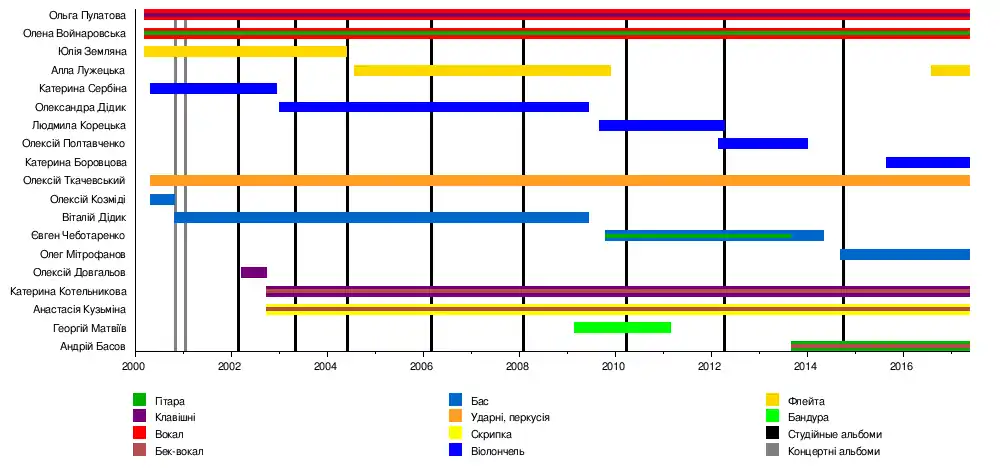 - Олена Войнаровська — гітара, вокал, автор пісень (2000—2017)