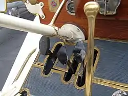 - Встановлені на колонці керма ручні важелі — керування дросельною заслінкою («газ») праворуч і випередженням запалювання ліворуч.