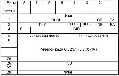 Використовується алгоритм кодування G.723.1, оскільки він вимагає найменшу швидкість (5.3 кб/с) VFRAD — пристрою телефонного доступу до мережі Frame Relay.