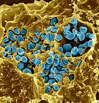 ![]() Макрофаги миши, які заражені Francisella tularensis (скануюча електронна мікрофотографія). , --- | ||||||||||||||