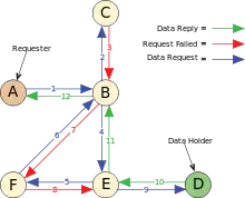 Інформаційний потік у Freenet має відмінності порівняно з такими мережами, як eMule чи BitTorrent: