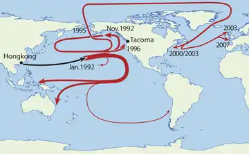 21 січня 1992 року, суховантажне судно що перевозило 30000 гумових каченят (Friendly Floatees) з Гонконгу до Такоми(США) потрапило в ураган, через це каченята відправились у вільне плавання. За три місяці перші 20 тисяч досягли берегів Індонезії, Австралії та Південної Америки. Решта десять тисяч за рік пройшла повз Аляску і ще за три роки потрапила в Тихий Океан, в Японію.